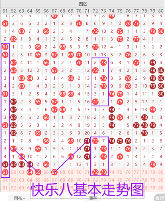 我们来看下四区的基本走势情况,上期开出了六枚开奖号码,本期预测开出5-6枚开奖号码,首先我们来烂61的空四重号对称形态,64 65的堵漏,66分边65 67,优先考虑61 64 67同路三码下二。72 73的对称形态二连建议二选一。