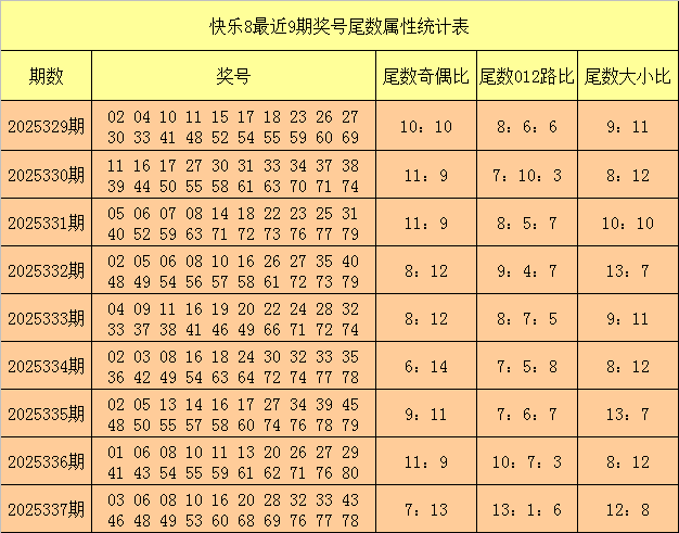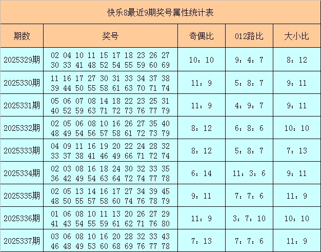 福彩快乐8第2025337期开出奖号:03 06 08 10 16 20 28 32 33 43 46 48 49 53 60 68 69 76 77 78,其中奖号奇偶比为7:13,大小比为11:9,012路比为7:7:6。