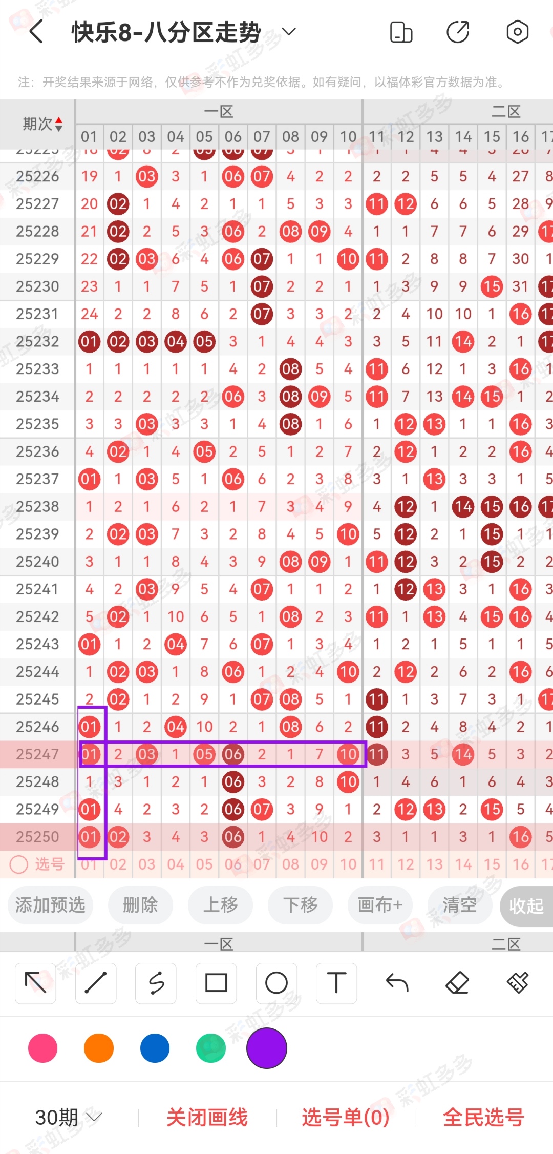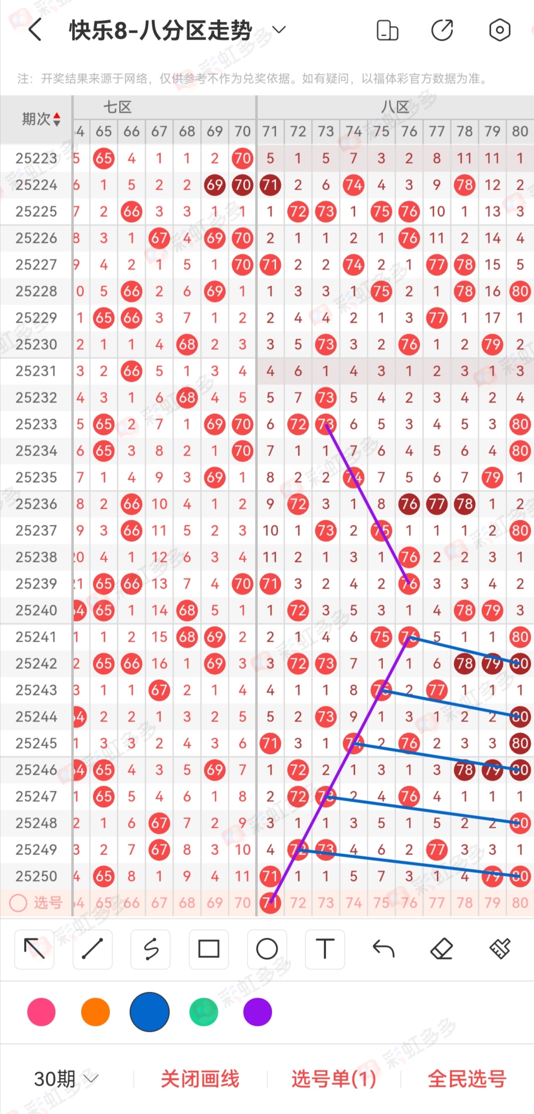 首先我们先回顾一下昨天的文章,也就是动态里面的内容。现在我们就可以猖狂的讲,1尾0尾同出的情况,如果存在号码有上重,那么存在间隔2期回补的逻辑。至少是一半的机会。昨天的01开出来了。那我们后面遇到这样的数据就可以大胆的单挑选二胆拖。一拖5打2组,只要拖码中一个就不会亏。所以这里的特点要记住。初始条件是1尾0尾同出且在同一个区间内,至于会不会同时走重这个就不要考虑了。另外还有一点,对于没有上重的1尾0尾,暂时并不能十分的说不会间隔2期给,只是目前出现的次数太少,总结不了规律出来。就比方说今天的71 80出现的状态可以为下一次做准备。以上就是昨天的内容。