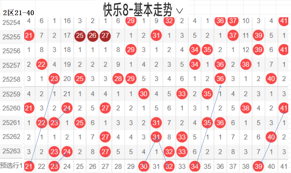 二区(21-40):遗漏5期以下有16个,0码23 24 27 32 33 5个,数据所示,冷码平均,选择条件增多了.上期开出了5个号码,出码比较分散.这期布防相应增加,重码按比例落这区较少,先给出关联码21,这个区间间接走势,温区,21-30区间上期开了3个,依旧不是重点选号区间,31-40区间开出2个,本期关注热码的回补,间隔小遗漏值最佳,3字头转热,这个小区热码注意回调,可以做关联码的布局,注重温冷码的回补.