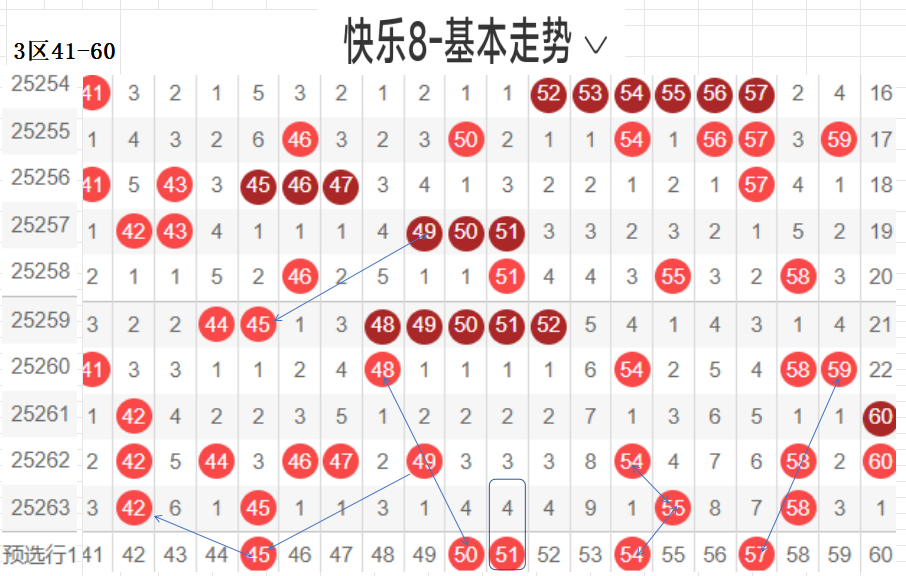 三区(41-60):遗漏5期以下有16码,0码42 45 55 58 4个,温开方式,这区码数有回暖之意,可以防一手,先定胆码走势较大者,隔期,斜三连,分边号码,可重防,间隔5期以上号码可以随走势选取,例如本期大冷码,走势比较大,可以做胆,通常联动可带出,分边对称的号码,本区间也有很大走势.可关注下.隐形夹角号码.做补位形态号码.都需要观察动态走势.以上是本区间的选码方法.