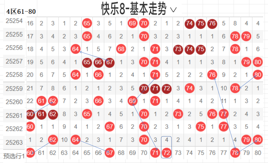 四区:(61-80):遗漏5期(含5)以下有18码,0码62 64 70 79 80 5个,平均温开方式,上期开出5码,区间回暖,后区可防,四区间从以往数据来看,重码很强,一枝独秀的存在,近期有回补走热的趋势,区间回暖后,本区间后区可防,与一区相比,也是温区.,对称下落码,隔期回补码,可以防守,这区对呈对称三角关系的胆码,斜三连有走势的胆码,联动落位码,都有各自的走向落位关系,根据走势选择一种方式选码.