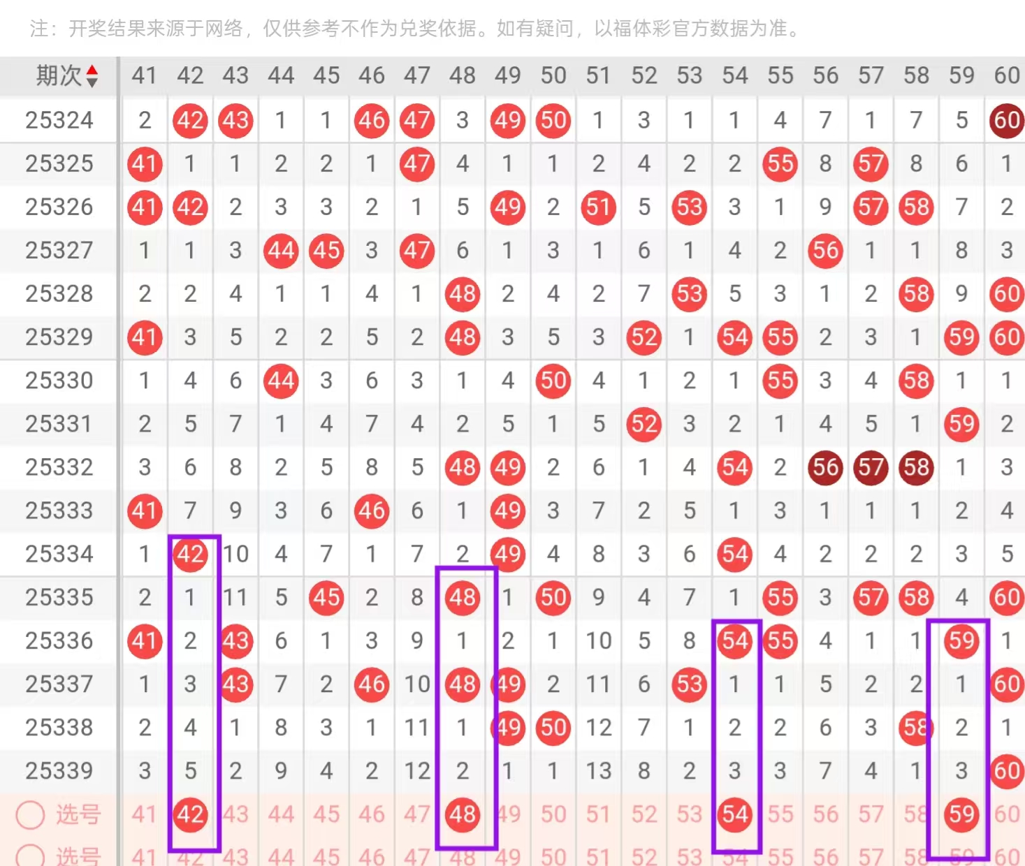 三区41-60:三区间,上一期回补了一个号码的下落,从近期三区间的号码下落点位来看,一直持续走冷,今天我们要重点关注的是3区间大遗漏的回补和对子下面的回补,在4头,首先我们要重点关注的是42-44-2下1的选择和48-50-2下1的选择,这里可用42-48的搭配和44-50的搭配回补,在中部位置,这里值得我们重点关注的是大遗漏47的下落点位回到5头位置,今天我们要重点关注的是54-55-2下1的选择和59-60-2下一的选择,这里可用54-59的搭配和55-60的搭配回补。