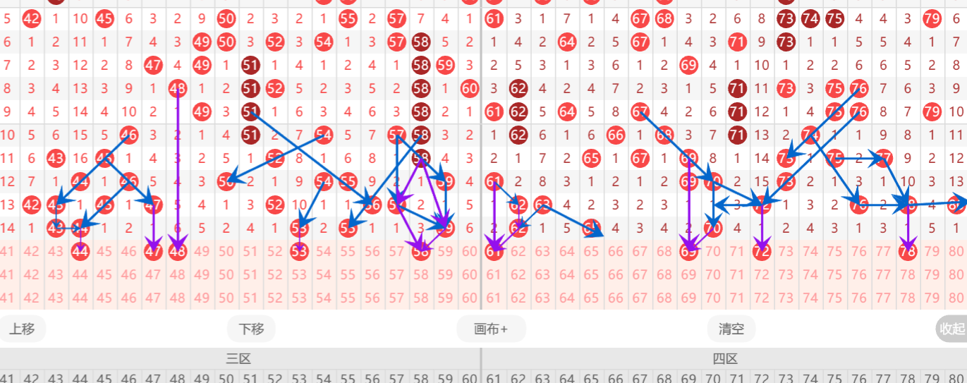 上一期第四区间开出:62.65.70.这三个号码整体是冷态,那么本期第四区间根据走势来判断我有以下几点建议。