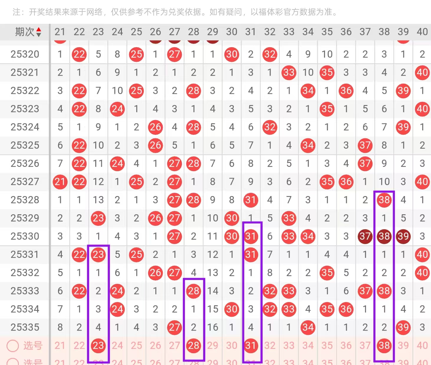 二区21-40:二区间,上一期回补了三个号码的下落,从近期二区间的号码下落点位来看,呈现出了由热转冷的形态,今天我们要重点关注的是二区间空缺位置的下落和对子,下面的回补,在02头,首先我们要重点关注的是23-25-2下一的选择和26-28-2下一的选择,这里可用23-28的搭配和25-28的搭配回补,回到三头位置,今天这里我们要重点关注的是31-40-2下一1的选择和37-38-2下一的选择,这里可用31-38的搭配和37-40的搭配回补,值得我们重点关注的是中部位置X形状的一个下落点位。