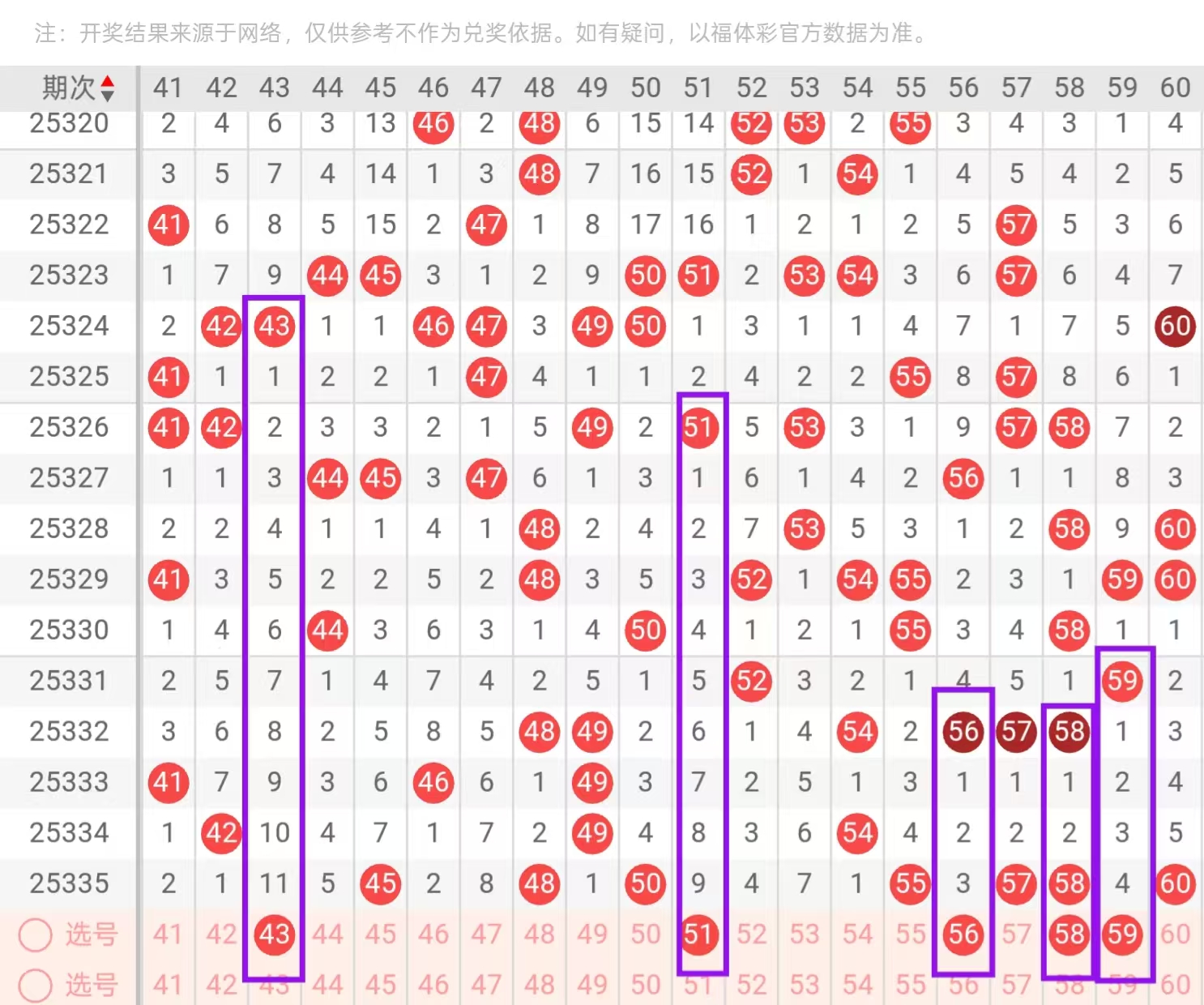 三区41-60:三区间,上一期出现了大面积的回补,总体回补了7个号码的回补,从近期三区间的号码下落点位来看,呈现出了由冷转热的形态,今天我们要重点关注的是三区间空缺位置的回补和大遗漏的回补,在4头,首先我们要重点关注的是41-43-2下一的选择和47-51-2下1的选择,这里可用41-43的搭配和43-51的搭配回补,回到五头位置。今天这里我们要重点关注的是对子下面的一个重码下落点位,这里要重点关注的是56-59-2下1的选择和57-58-2下1的选择,这里可用56-58的搭配和58-59的对子形态下落。