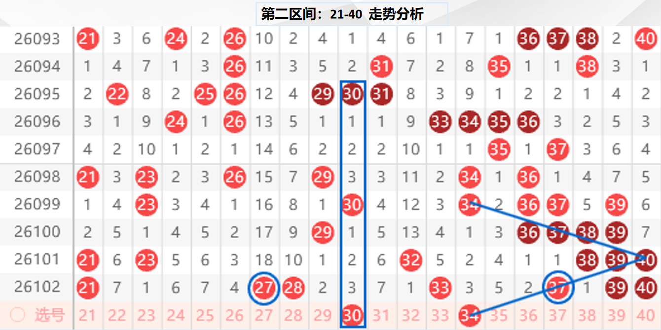 二区分析:【21-40】(走势图标注号码非小黄车大底,请谨慎参考,具体思路将在直播间分享讨论)