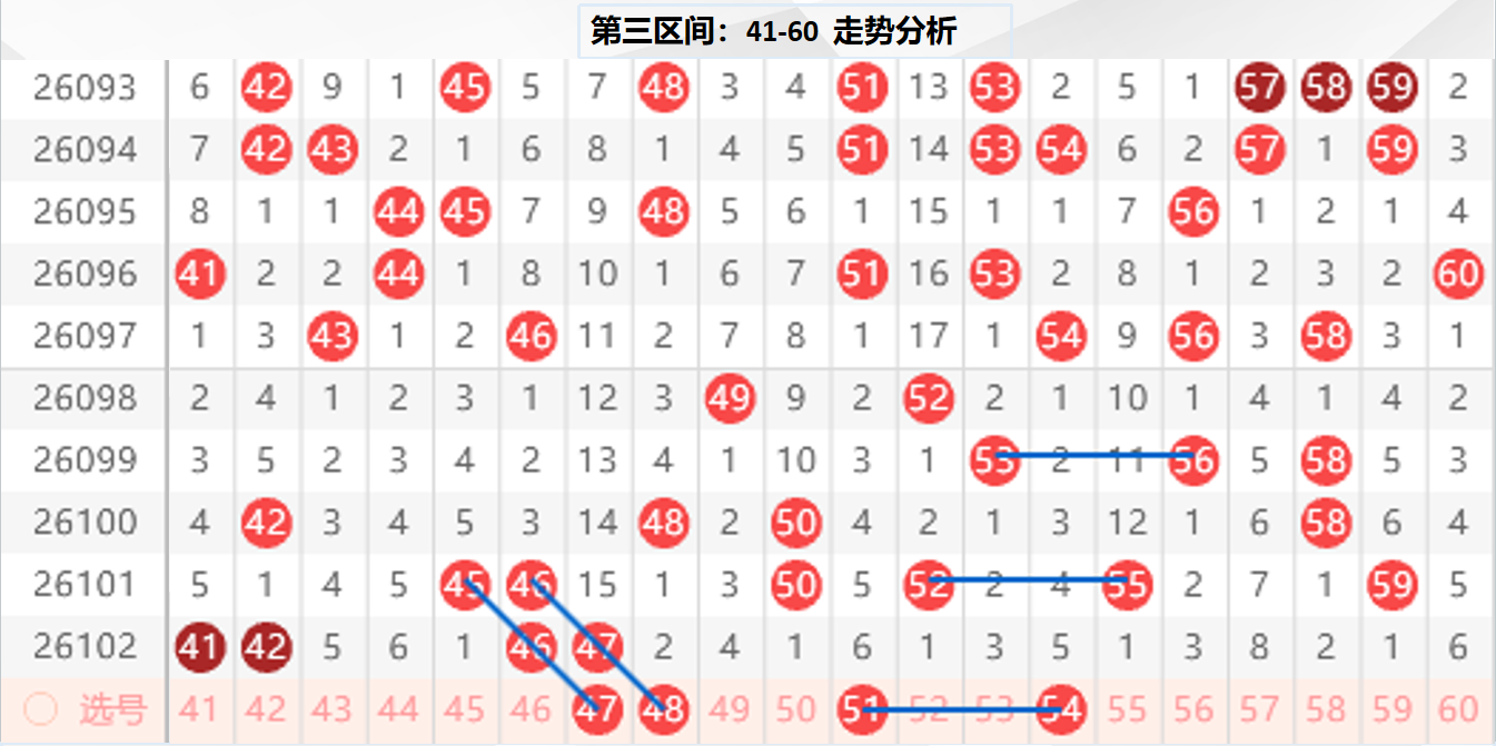 三区分析:【41-60】(走势图标注号码非小黄车大底,请谨慎参考,具体思路将在直播间分享讨论)