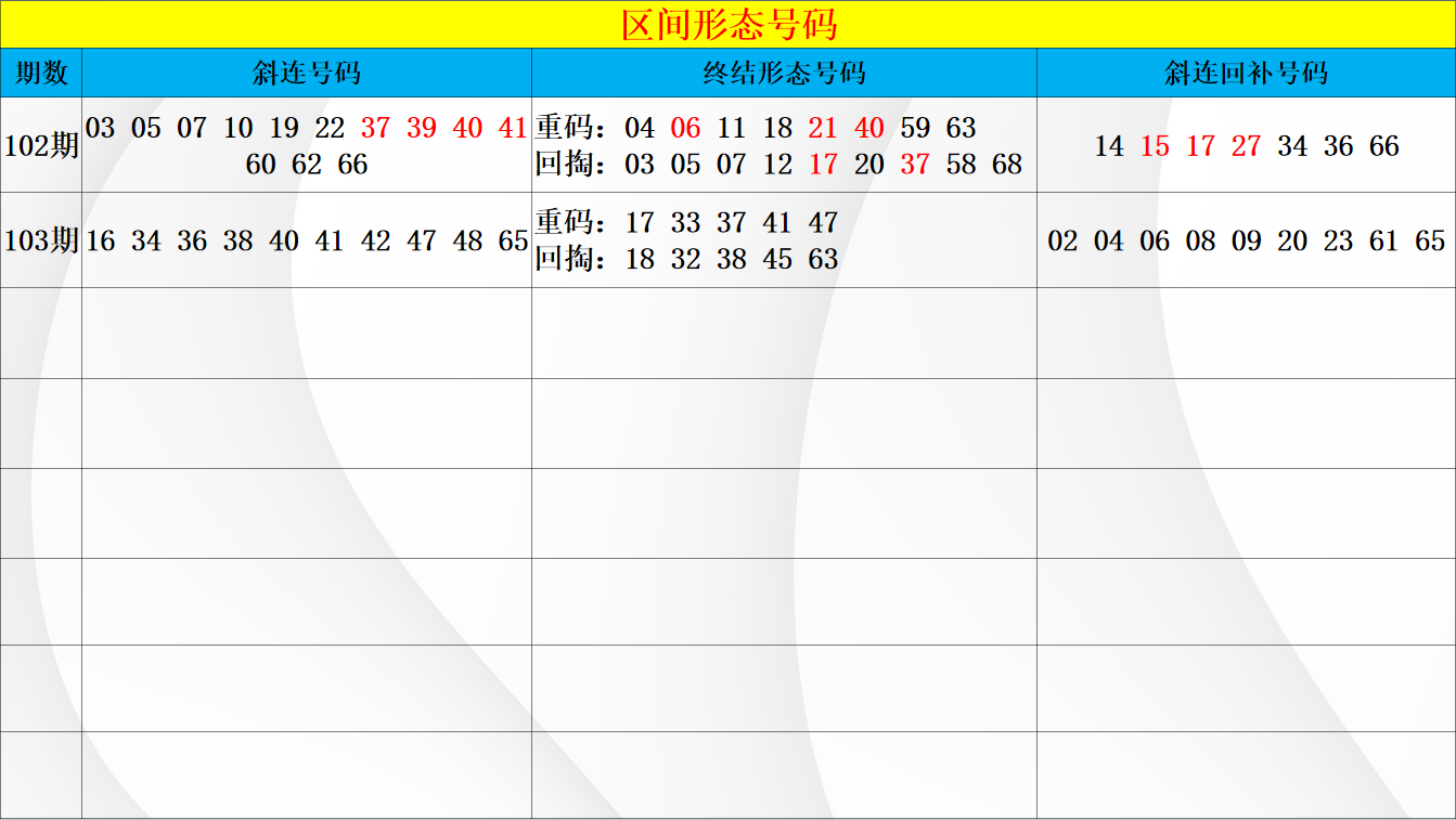 上期三区回调,区间也是再次轮到了断头的青睐,形态上同尾的分边依然是考虑的重点,且重码中也是有接力的点位号码开出。从区间做形态上的优先判断,重码的回补中还是要侧重考虑在41 42的两码位置,46 47的空位阶梯在百期的出号形态上大多是以分边48和放空为主,考虑区间的形态布局上重点还是三码中的出号选择。断头回补中近期在各个区间上都是有小周期号码和温冷的同时回补,其中回补上更多是以孤码下方的出号形态为主,本期注意在52 55两码下方的优先布局选择,小周期号码关注52 53 55 56四码中的开号。而在温冷号码中两码下方也是有51 54的选择为主以及在后区的连隔下方的开号位置,温冷中注意在51 54 60三码上的布局,组合上注意容错和孤码隔期开连号的出号形态。