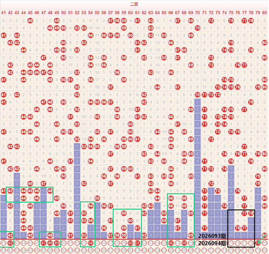 如图所示:在本期大数区的选号中注意在上期的走势中三区间开出了8枚中奖号码,落号数量仅保持一期的下调走势,上期三区间的落号数量直接上升至区间的最高位走势,本期要注意三区间的落号数量继续保持着较强的走势,重点关注上期开出58 62的位置,重点考虑继续保持延续走势,上期龙头位置开出42 45 48 51的同路四码走势,本期注意单点位的多码走势,个人较为看好48的位置下方开出多码走势,可关注47 49的分双边走势,尾部位置注意60 61的二连走势,四区间上期开出了3枚中奖号码,前段位置保持着62的斜线第四期走势,本期注意62的位置前后出现号码,在上期69的位置开出号码,以及67的重号二期下方出现了断号走势,本期注意66 68的偶数回补走势,尾部位置考虑80的重号走势,以及79的边号延续走势。