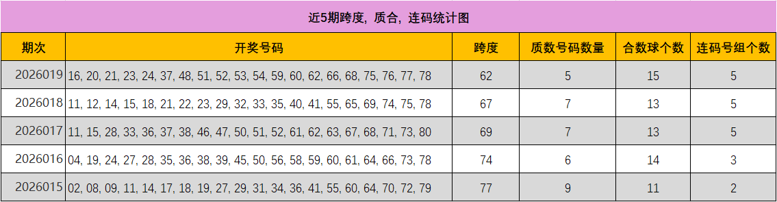 本期观点:上期质数骤降至5个,合数占比高达75%,达到极端值。近五期合数优势巨大。根据物极必反的规律,本期质数个数强烈看涨回补,预计可能大幅回升至8-10个。关注质数:23, 29, 31, 37, 41, 43, 47, 53, 59, 61, 67, 71, 73, 79。关注合数:16, 20, 21, 24, 48, 51, 52, 54, 60, 62, 66, 68, 75, 76, 77, 78, 80。