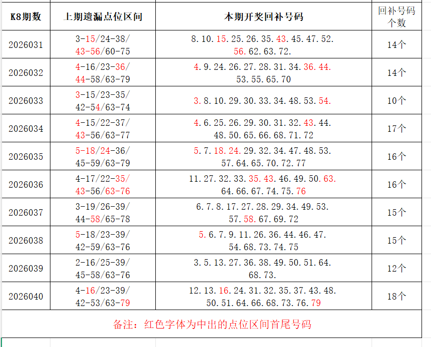 如图,上期的遗漏号码在下期开出10个左右,即为回补号码。定准点位区间首尾号码是关键!以上期2026040期为例,定位4个遗漏区间,围中18码!结合上期开奖号码,以跨度值大于或等于7为依据,本期关注4个遗漏区间:1-12/16-24/24-31/55-64;重点关注遗漏区间:2-15/23-36/42-56/63-77。点位区间号码和大底号码请勿混淆,个人分析,仅供参考。