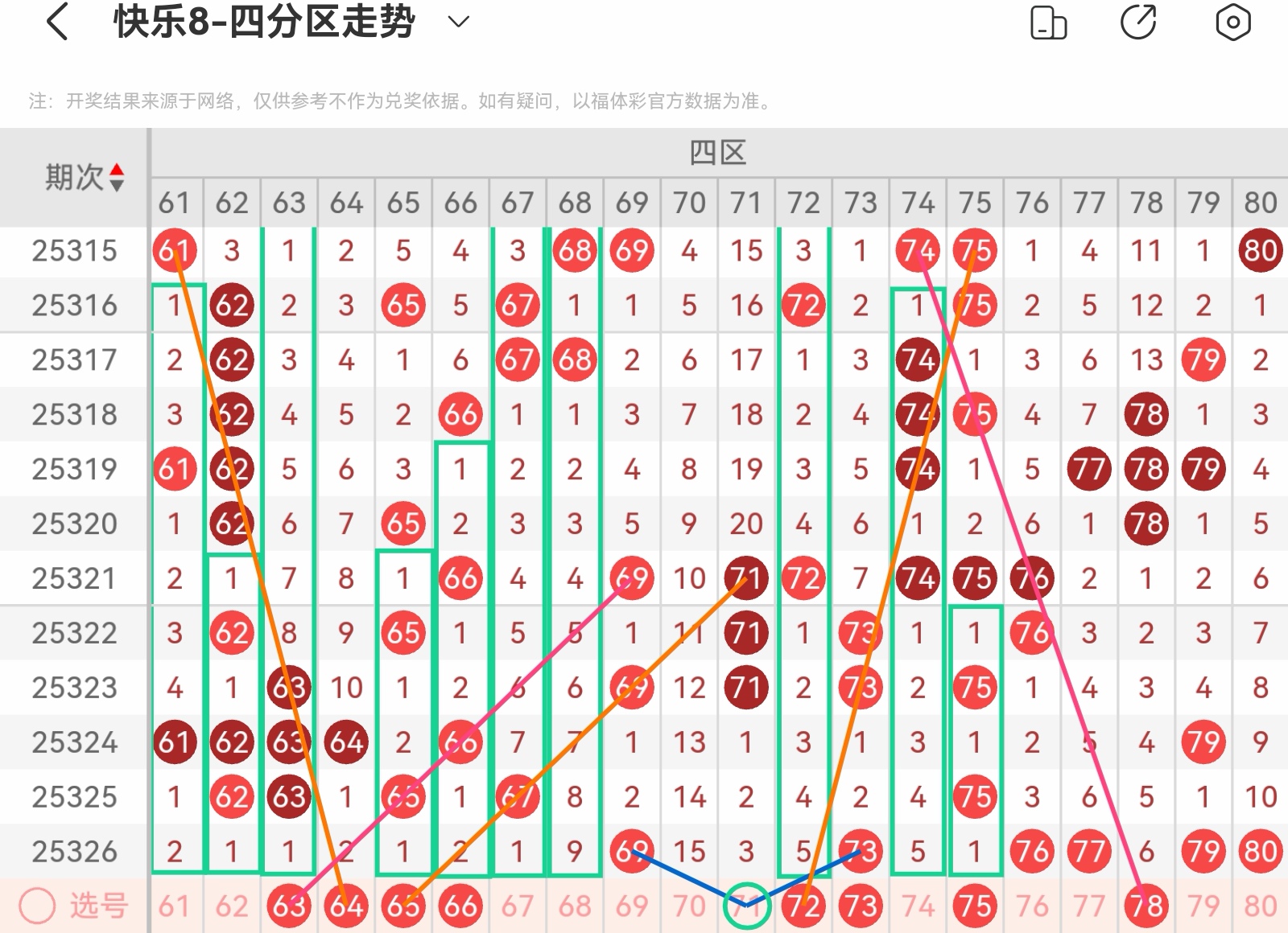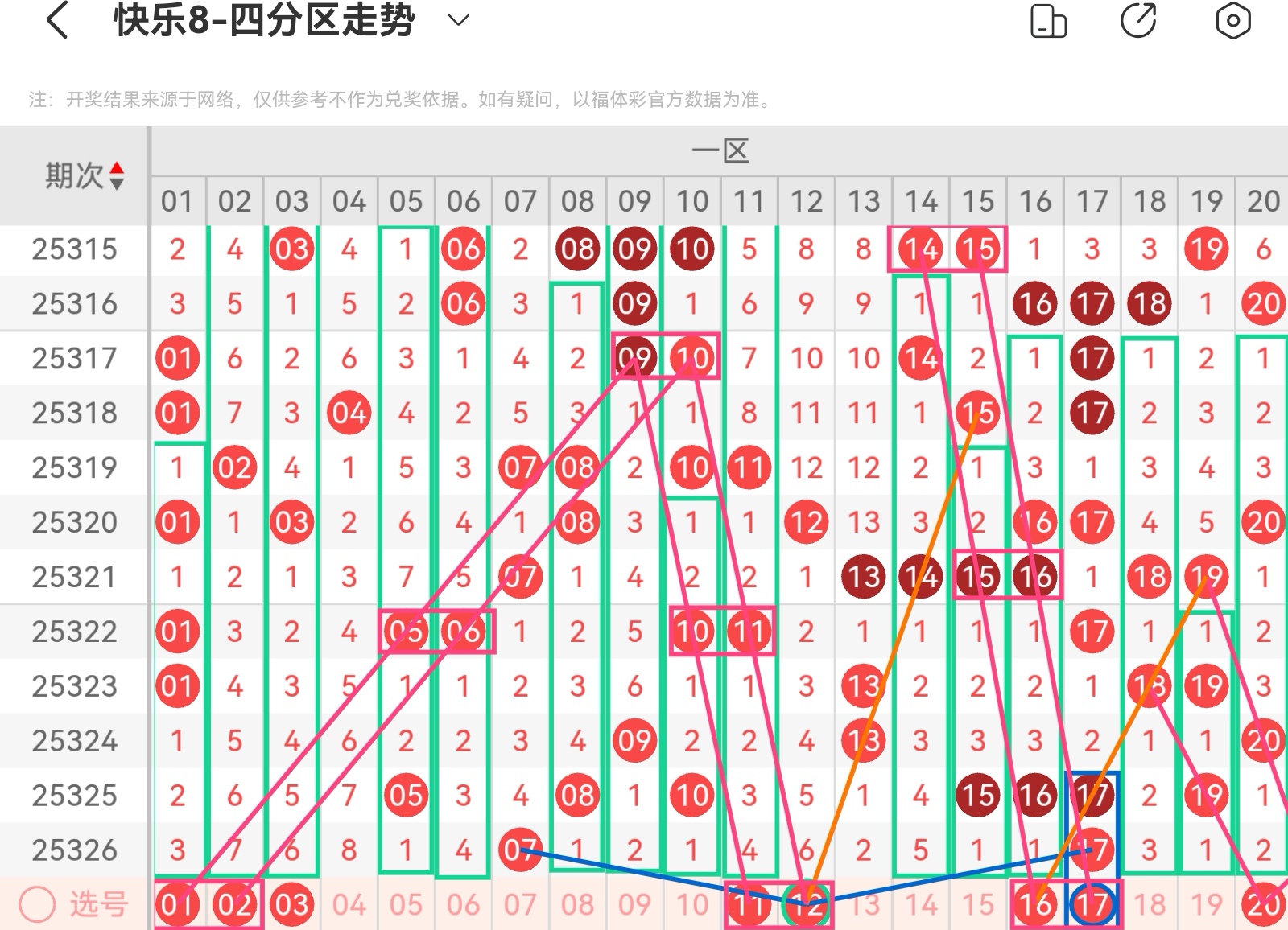 大家好,我是甜丝丝的坏事,主要以快乐八的形态走势、空位走势、遗漏走势以及斜连走势相结合的方法,用公认的四分区走势来进行预测分析,希望能让你有所收获。