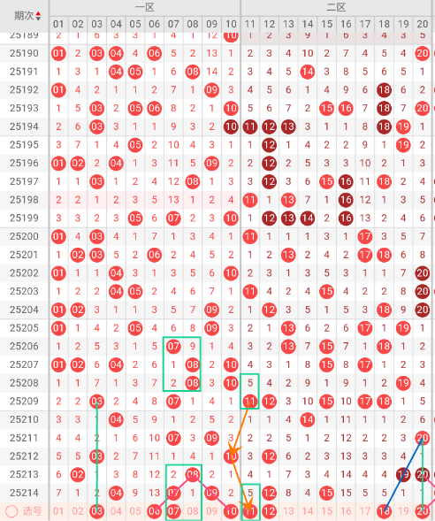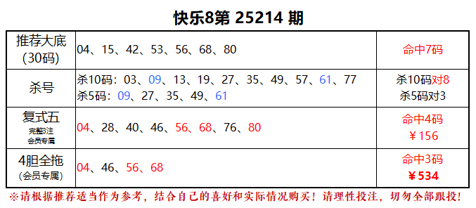 结合上期的数据分析,对快乐8第25215期的推荐如下: