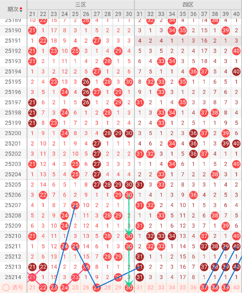 三区开出:21,25,29 奇偶比: 3:0 和值:75 跨度:8,上期开出3个号码,奇数号码占优势。本期三斜连走势:22 24,隔码斜连走势:23 27,近10期平均出号2.6枚。推荐关注号码:23、24、27、30。