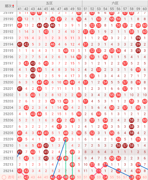 五区开出:41,42 奇偶比: 1:1 和值:83 跨度:1,上期开出2个号码,奇偶数号码均衡。本期三斜连走势:42,隔码斜连走势:46。近10期平均出2.7枚,本期推荐关注号码:46、47、48、49。