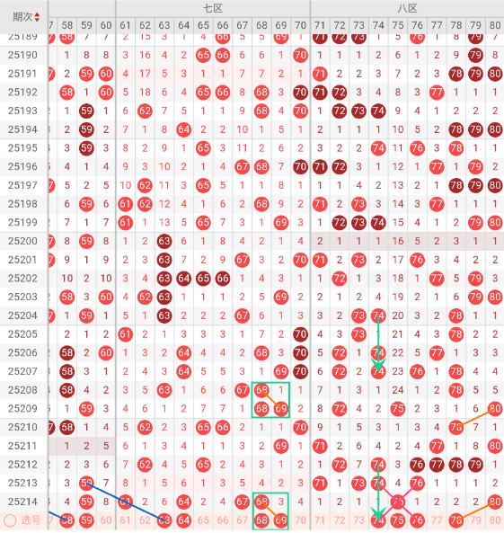七区开出:61,64,67,68 奇偶比: 2:2 和值:260 跨度:7,上期开出4个号码,奇偶数号码均衡。本期无三斜连走势,隔码斜连走势:63。近10期平均出号2.4枚,本期推荐关注号码:63、64、68、69。
