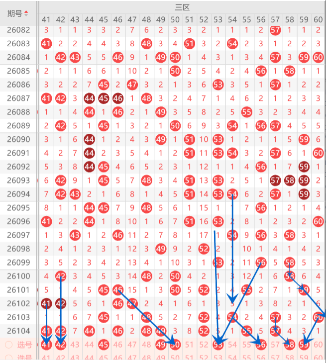 三区间在近期的走势上分析,三区间是走热形态,上期三区间开出了9码,而且上期开出的形态是重码和隔期回补假四连走势,上期小妹在文章中布局到了6码开出,那么本期重点关注的形态是重码分边,斜连号下拉,那么本期首先注意重码分边上的51.53.56.58中选择1-2码分边机会,而斜连号下拉位置上注意43.50.56中选择1码下拉机会,上期重点关注在孤码分边上布局到了3码开出,那么本期重点关注在重码走势上布局一码订胆机会,如图所示。