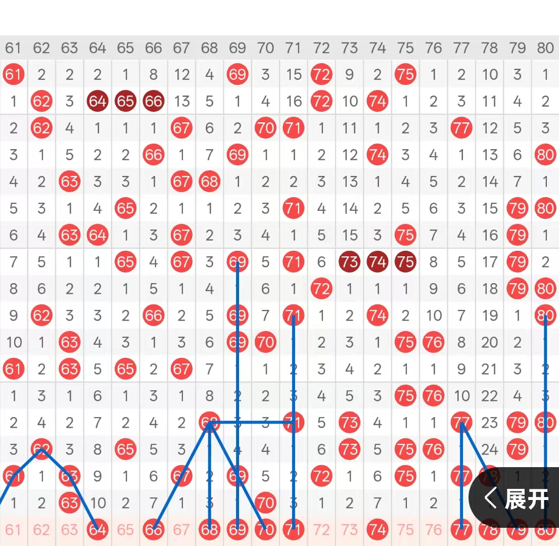 四区:上期四区间开出了两码,6字头头部位置3期遗漏做重的63,尾部位置开出了孤码69的号码五期遗漏下落的70,中部位置处于放空状态。七字头上期一码没开出,处于放空状态,形成了断区。本期六字头头部位置可关注61的菱形下落,其次分边号码6062,做二选一即可。中部位置考虑65的两期遗漏回补与62做二选1,6769两码空1回补,也是二选1的号码。其次66的七期遗漏在本期值得关注,尾部位置70五期遗漏座成作为防守号码即可。七字头本期关注71的三期遗漏下落,且是等距3号码开出,与尾部位置80同形态,做二选一即可。中部位置关注七十五七六七十七三码的下落,考虑7577空1回补,且77与78属于对子空1下落,近期大遗漏空1属于高频,可重点关注。