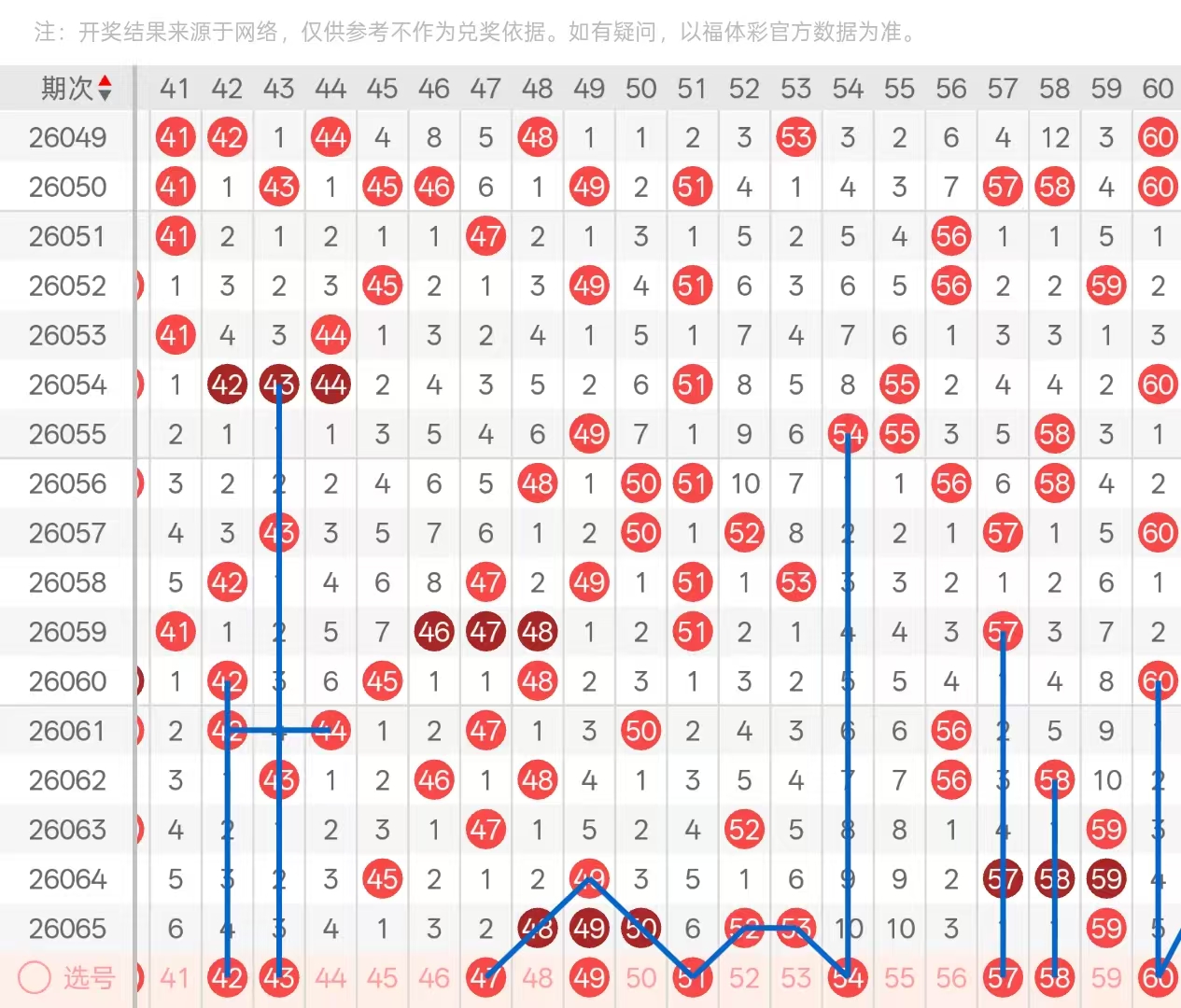 三区:三区间上期开出6码,四字头尾部位置四十八四十九五十的三连号,前端一码没开出,处于放空状态。五字头开出头部位置空一回补的52和53的六期遗漏回补,以对子形态开出,尾部位置开出59的3重,中部位置也处于放空状态。本期四字头头部位置可关注4244两码的2选1下落,41的6期遗漏回补可作为防守号码开出,尾部位置关注484950三连号的分边号码47开出,两期遗漏回补,与51做二选一即可。五字头头部位置关注5253对子的一码座重,其次对子的分边号码5154两码,也要考虑一码的开出,优先考虑54的下落,五十四五十五两码对子的十期遗漏回补考虑1码开出,优先考虑54,尾部位置59的三重,关注分边号码5860两码二选1,其次防守57的空1回补。