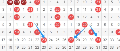上图是福彩快乐8开奖号码走势图其中一部分,我标志出来的数字23 27 31都是斜连号码,数字23一直从数字21斜连下来,数字27一直从数字29斜连下来,数字31一直从数字29斜连下来,通常快乐8喜欢出斜连号码。