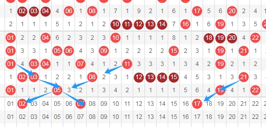 上图是福彩快乐8开奖号码走势图其中一部分,我标志出来的数字07 17都是跨度二斜连号码,数字07一直从数字01斜连下来,数字17一直从数字21斜连下来,通常快乐8喜欢出斜连号码。数字02属于跨度三斜连号码,看蓝色箭头,一直从数字11斜连下来的数字。
