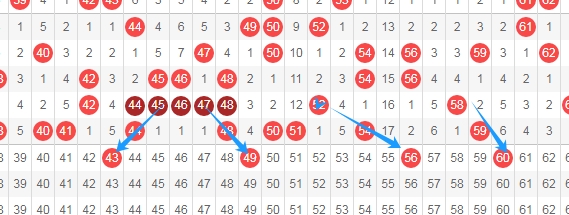 上图是福彩快乐8开奖号码走势图其中一部分,我标志出来的数字43 49 56都是斜连号码,数字43一直从数字46斜连下来,数字49一直从数字46斜连下来,数字60一直从数字58斜连下来,通常快乐8喜欢出斜连号码。数字56属于跨度二斜连号码,一直从数字52斜连下来的数字。
