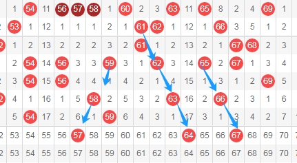 上图是福彩快乐8开奖号码走势图其中一部分,我标志出来的数字57 64 67都是隔一期的斜连号码,数字57一直从数字59隔一期斜连下来,数字64一直从数字61隔一期下来,数字67一直从数字65隔一期下来。