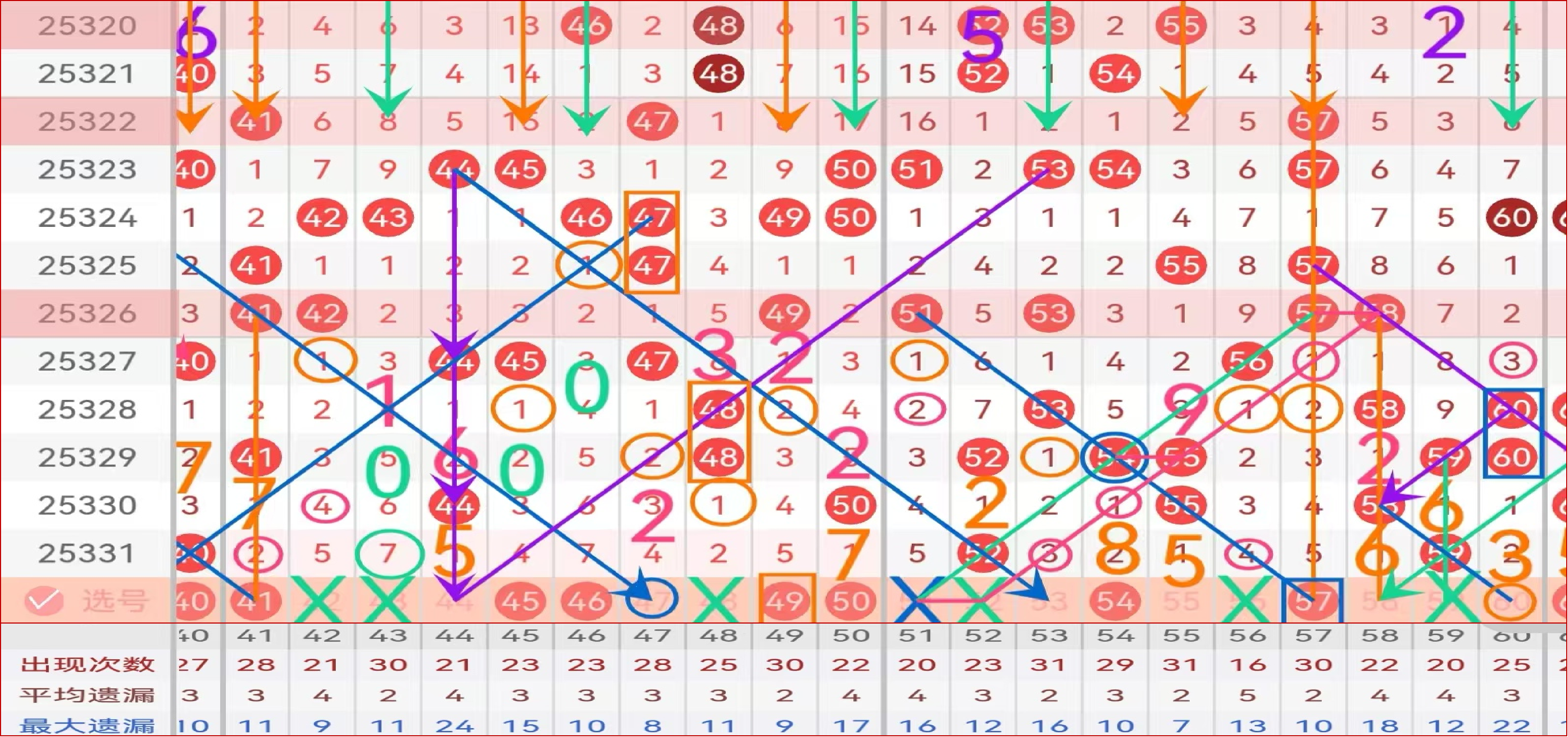 三区间推荐主做号码:41 45 46 49 50 54 57 防守号码:47 60;