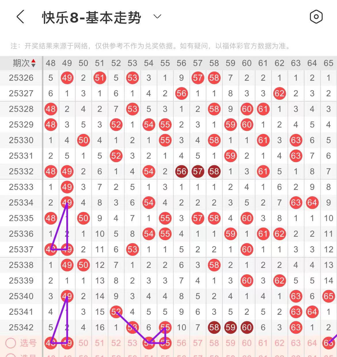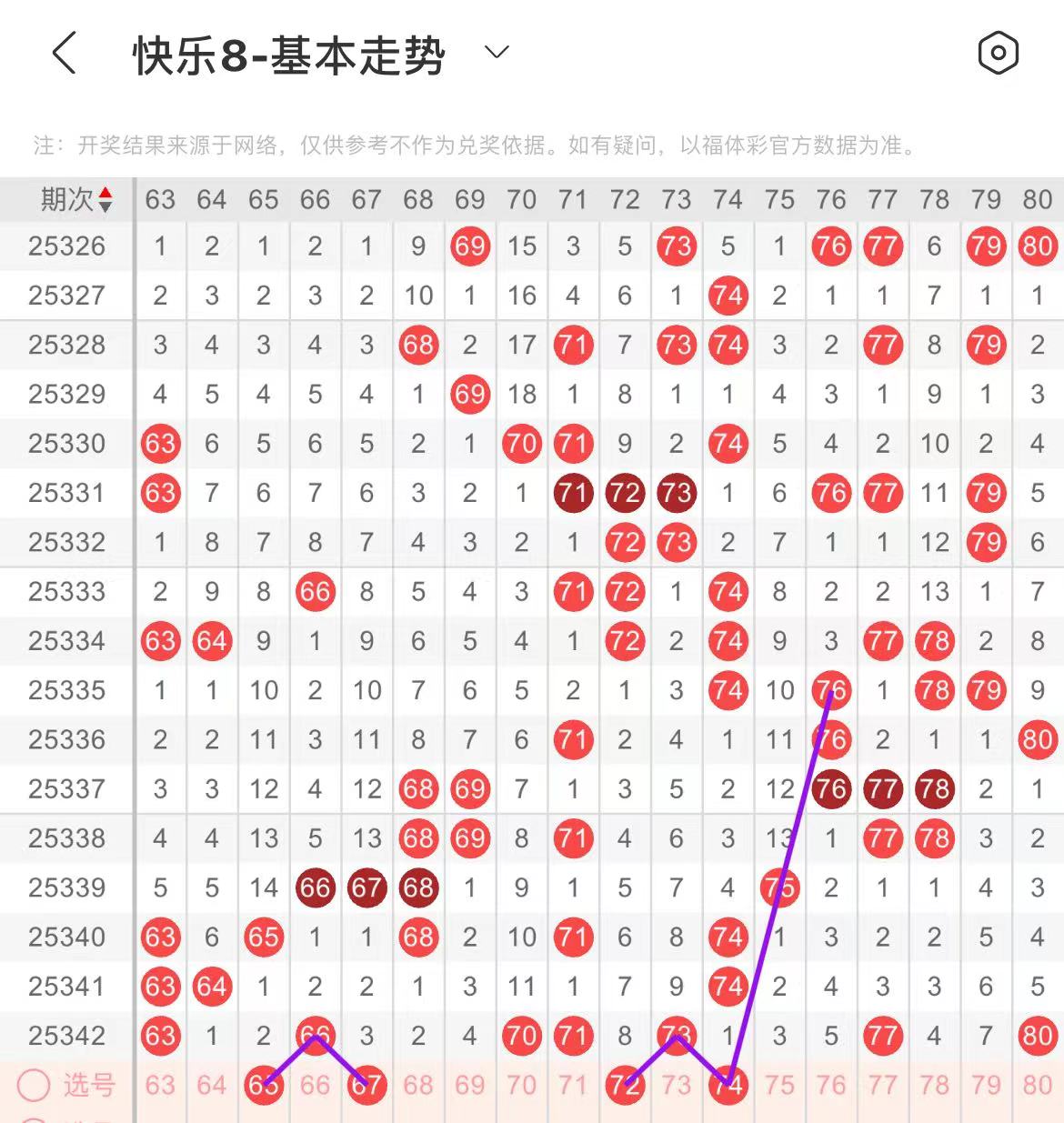 71-80区:本区间上期开出了四个号码,从号码走势图上看,本期重点关注前半区号码回补,出号个数在两个号码左右。有出号走势的号码有72.74号,做分边出号考虑。