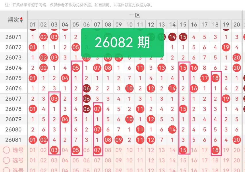 上期第一区间开奖7个号码,本期可能会减少开出。 03、05、07是连续的小奇数,占据一区前端位置,三个号码形成连贯的奇数梯队,彼此间距均匀,能填补一区前段的号码空白。15处于一区正中间位置,是衔接前段与后段的核心点位,能平衡整个一区的选号跨度,避免选号过于集中在某一小段,同时作为中部奇数,和前端三个小号形成奇偶交错的布局。18是一区后段的偶数号码,靠近区间尾部,和前段奇数形成奇偶互补,