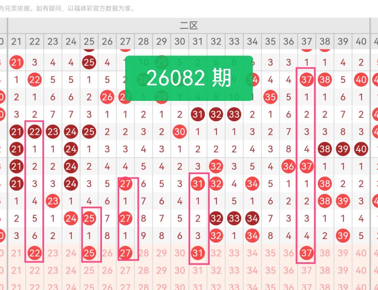 上期第二区间开奖3个号码,本期可能会增加开出。22作为二区开头的首个偶数,是区间的过渡性号码,位置靠前,能稳住二区前端的出号基础,避免奇数过多导致布局失衡。25、27是二区中段的相邻奇数,两个号码间距小,属于紧凑的奇数组合,能抓住二区中段的出号热点,提升号码关联性。31靠近二区尾部,与周边号码走势贴合,属于区间后半段的关键点位,起到承托二区后段的作用。37处于二区末尾位置,进一步拉长选号跨度,让二区选号从前端22延伸至尾端37,覆盖21-40全区间。
