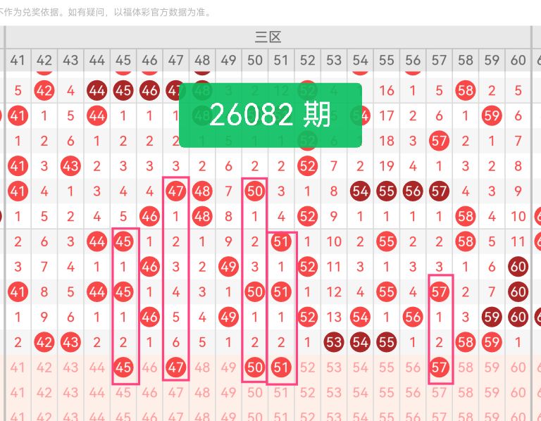 上期第三区间开奖个7号码,本期可能会减少开出。45、47是三区中段的奇数号码,两个号码间隔2,属于紧凑的奇数组合,占据三区核心位置,是三区出号的核心区域,贴合近期三区热门出号段的走势。50、51是相邻的连号,一偶一奇,位于三区正中心,属于号码聚集的关键点位,连号组合能提升号码的联动性,也契合三区常出连号的特点。57处于三区后段位置,衔接中部与尾部,填补三区后段的号码空白,避免选号集中在中部而忽略尾部,让整个三区选号从中段45延伸至后段57,分布均匀。