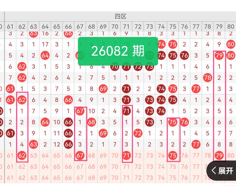 上期第四区间开奖3个号码,本期可能会增加开出。62处于四区前端,是区间开头的关键偶数号码,位置靠前,能筑牢四区前端的选号基础,作为偶数也能平衡四区整体的奇偶配比。67位于四区前中段,衔接62与后续号码,间距适中,既不会和前端号码过于紧凑,也不会脱节,是四区过渡阶段的核心号码。71、75是四区中段的奇数号码,两个号码分散分布,填补四区中段的号码空白,避免中段出现选号断层,同时奇数搭配也能中和偶数的占比,让整体奇偶更均衡。79是四区末尾号码,靠近80收尾,占据区间尾端位置,让整个四区选号从前端62覆盖至尾端79,实现61-80全区间无死角覆盖。