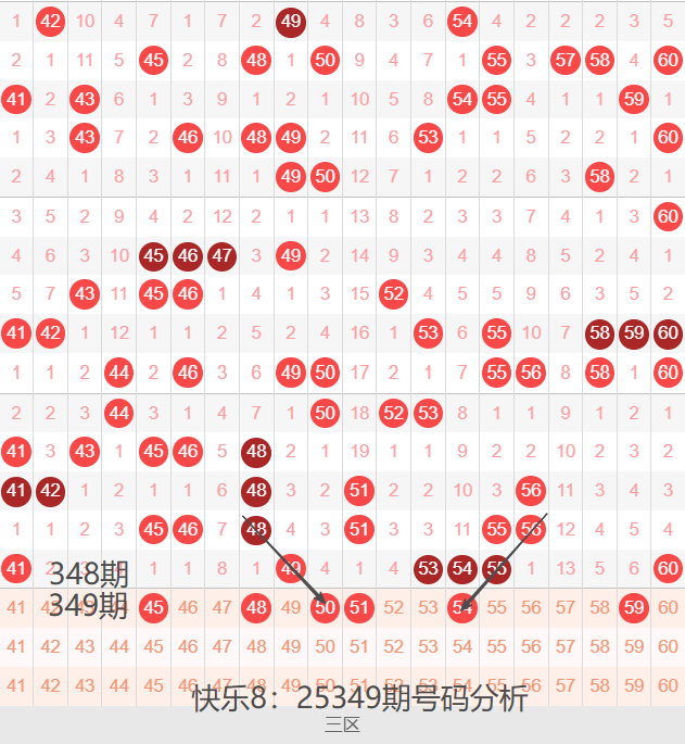 上期该区间开出号码:41 40 53 54 55 60,6个号码球,区间呈现热开,区间整体上目前是在热开的周期,号码出号近期也比较平均,分布相对与其他大区间来说很均衡,本期二区间个人预选号码:45 48 50 51 54 59,45号是遗漏间隔1期的对称号码,48号是遗漏1期的状态,50号是三斜连落位走势,遗漏4期号码,51号是遗漏1期的号码,54号本期看重码的机会,三斜连落位点,59号是遗漏6期的号码,通过以上分析,三区间终选号码:45 51 54 59。