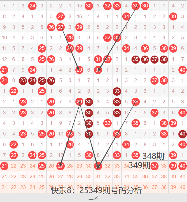 上期该区间开出:22 24 25 30 33 35 39 ,7个号码球,上期区间热开,二区间目前的状态整体可能要开始走温热状态,近期可以开始多关注区间内空位的回补形式,本期二区间个人预选号码:21 25 27 31 37 39 40,21号是遗漏7期的号码,25号本期看重码的机会,27号是均线三斜连落位走势,遗漏12期的号码,31号是遗漏8期的号码,双线斜连的夹角落位点,37号是遗漏4期的号码,39号本期看重码的机会,40号是梅花状态,遗漏1期的号码, 通过以上分析,二区间终选号码:25 27 31 39 40 。