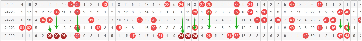 可以看出,每一组对应号码两两差值为40。这一组对数在2024229期开出5个。