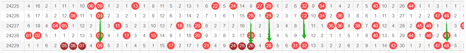 我感觉选热的同时,还要注意防冷条件开出,可以直接选取每个号码跟随出次前三的号码,也可以考虑把出次最后的三个数字加进去,不过这样可能号码太多,可以尝试。图上也能看出单独号码跟随的情况,我就不一一统计每个号码的出次了,我这里考虑提高概率,取每个号码历史跟随的前三号码和后三号码,根据2024229期的号码,我关注正数3和倒数3的号码号码为: