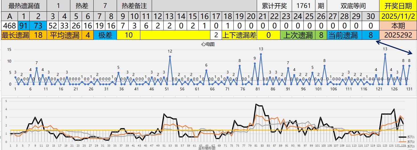 2、当前遗漏8,历史上开了16次,遗漏榜是与遗漏6并列第7名,算是有点热的遗漏值。上次开出遗漏值是8,与当前遗漏值形成了双底等间周期。而从第2025266期遗漏13开出后开始的本轮长周期,期间遗漏峰值为8,有且只有一次,当前遗漏值平了期间遗漏峰值纪录。另外,从2025176期遗漏13开出后开始的一轮长周期,期间遗漏峰值也是8,可见遗漏8在最近一段时间的封顶作用力有多强了。