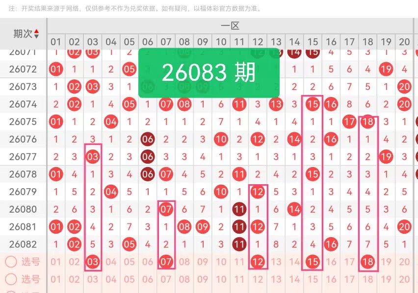 上期第一区间开奖4个号码,本期可能会增加开出。03处于一区前端,是近期前端号码中走势较为温和的号码,前期虽未频繁开出,但始终保持着稳定的出号频率;07与03形成间隔呼应,同属小尾数奇数,在一区前半段形成有效覆盖,弥补近期小尾数号码偶尔断层的缺口;12位于一区中部,是区间内的核心出号点位,不会出现长时间断档的情况;15处于一区中后段,衔接中部与尾部号码,和12形成间隔搭配,让中部到后段的出号覆盖无空白;18则落在一区尾部,靠近二区分界处,既能承接一区的出号走势,又能与二区号码形成联动。