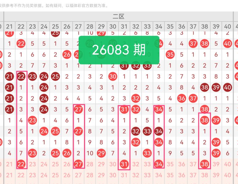 上期第二区间开奖6个号码,本期可能会减少开出。22处于二区前端,是上期二区开出号码的邻号,延续了上期二区前端的出号惯性,避免热区号码突然断档;27位于二区中段核心位置,是二区出号频率较高的热点点位,近期走势始终保持平稳,没有出现大幅波动;31紧邻27,属于二区中后段的奇数号码,与27形成间隔搭配,进一步强化二区中段的出号覆盖;34处于二区中后段,与31形成奇偶搭配,间隔距离适中,既不会与31过于密集,也不会出现区间空白,承接中段与尾部号码,让二区整体出号链条更完整;38落在二区尾部,临近三区分界处,属于二区尾部的温号,近期走势逐步回暖,防范二区尾部号码反弹出号。