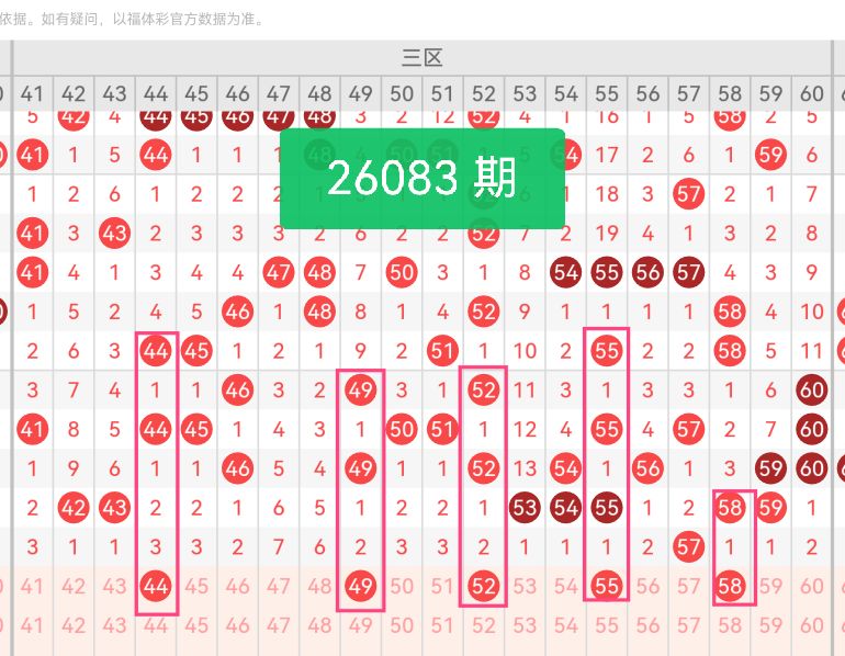 上期第三区间开奖个1号码,本期可能会增加开出。44处于三区前端,是三区前半段的首个回暖号码,近期走势出现明显的回升迹象,作为偶数号码,率先填补三区前端的出号空白,开启三区回补节奏;49紧邻44,属于三区前半段的奇数号码,与44形成奇偶搭配,间隔距离合理,进一步巩固三区前端的出号覆盖,避免前端号码断档,同时衔接三区中段;52位于三区中段核心位置,是三区的关键出号点位,始终保持着潜在的回暖趋势,是三区回补过程中的核心号码,承上启下连接前后段号码;55处于三区中后段,与52形成间隔搭配,奇数属性平衡中后段的奇偶比例,同时靠近三区尾部,与58形成联动,让中后段出号更连贯;58落在三区尾部,临近四区分界处,近期走势平稳回升。