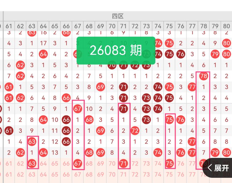 上期第四区间开奖9个号码,本期可能会减少开出。63处于四区前端,是前期四区热号的邻号,依托热区的走势惯性,具备较高的出号概率,同时作为奇数号码,填补前端非密集出号区的空白;67位于四区中段前侧,与63形成间隔搭配,属于四区的温号,走势平稳,不会因前期热号波动而受影响,是四区中段的稳定出号点位,承接前端与中后段号码;71处于四区中段核心位置,是四区出号频率较高的点位,历史走势活跃,近期虽未频繁开出,但始终保持稳定的运行节奏;75紧邻71,属于四区中后段的偶数号码,与71形成奇偶互补,间隔距离适中,进一步扩大中段的出号覆盖,同时避开前期密集出号段,让中后段出号更分散;78落在四区尾部,是四区尾部的温号,近期走势逐步回暖,同时与前端63形成首尾呼应,让四区从首到尾的出号覆盖更全面。