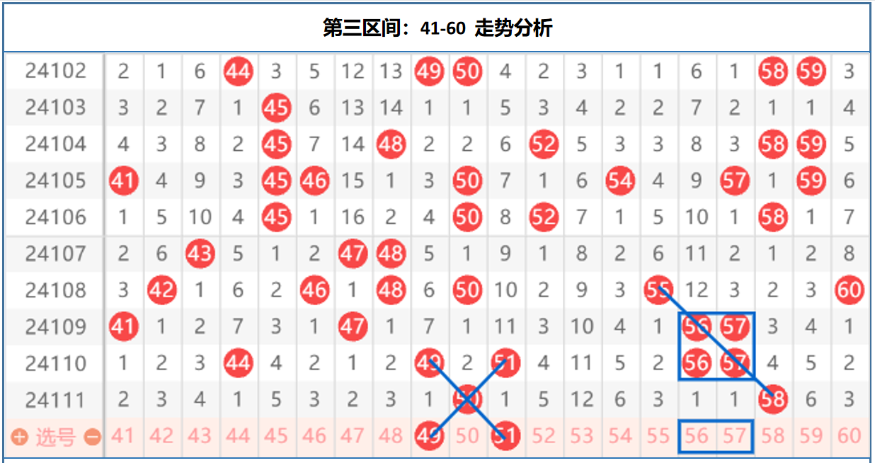 三区分析:【41-60】(走势图标注号码非小黄车大底,请谨慎参考,具体思路将在直播间分享讨论)