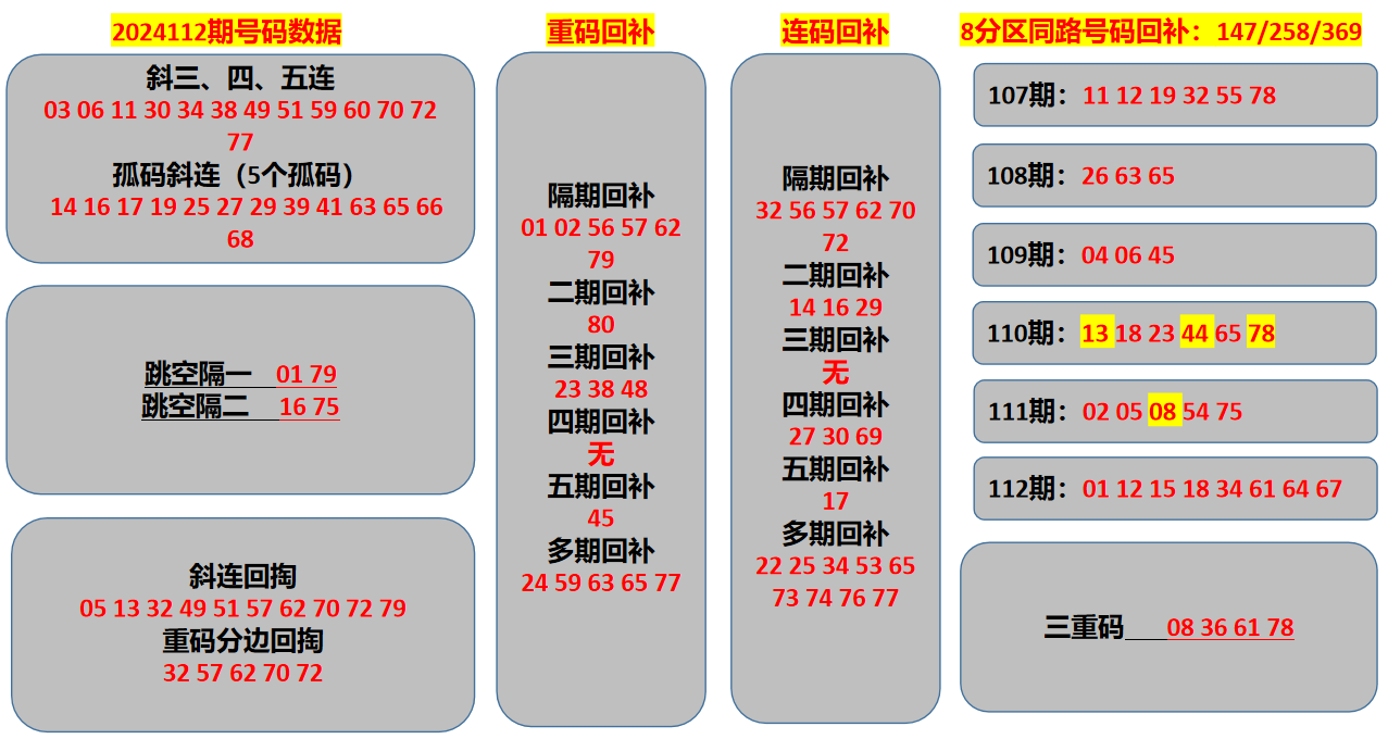 上期四区也开出了同路全出的61 64 67,从四区的同路号码做下期的布局上判断,分边的机会大于重码的机会,但从58 61 64 67的肆哥同路号码出现后做重码回补中本期还是要关注下四区的重码机会,判断上冷回补中67出现的机会比较大。后区中做周期形态回补和终结走势上在本期可特别关注73 76 77三码的回补,以及在交叉走势中出现的78 80的择一机会。