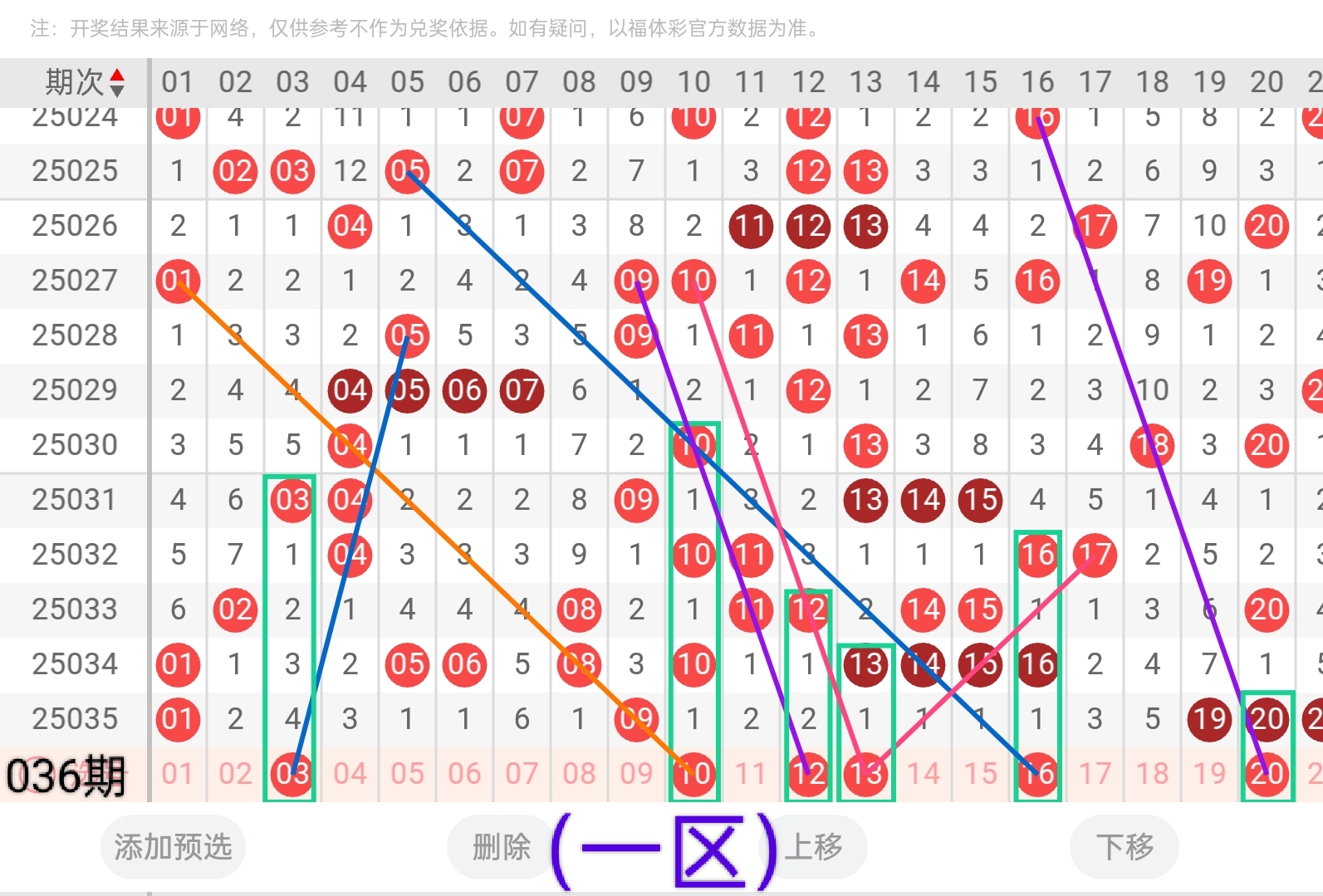小梁结合最近五期第一区开出号码比例6:5:7:9:4取五期的平均值,预判本期第一区间开出的号码个数约为6个。首先,我们先来说说龙头数字03,如上图画线思路所示,号码03与前几期开出的号码呈斜三连的走位且呈隔四期回补的走势。其次,我们根据上图画线的思路可以看出,号码10与前几期开出的号码呈连续隔期回补的走势且呈斜五连的走位;号码12与前几期开出的号码呈斜四连的走位且呈隔两期回补的走势;需关注。然后,号码13与前几期开出的号码呈隔期回补的走势且呈两条左右斜三连的走位;号码16与前几期开出的号码呈斜四连的走位且呈连续隔期回补的走势;号码20与前几期开出的号码呈直连回补的走势且呈斜三连的走位。综上所述,预判本期第一区开出的号码个数约为6个,预判本期第一区开出的号码是03、10、12、13、16、20。