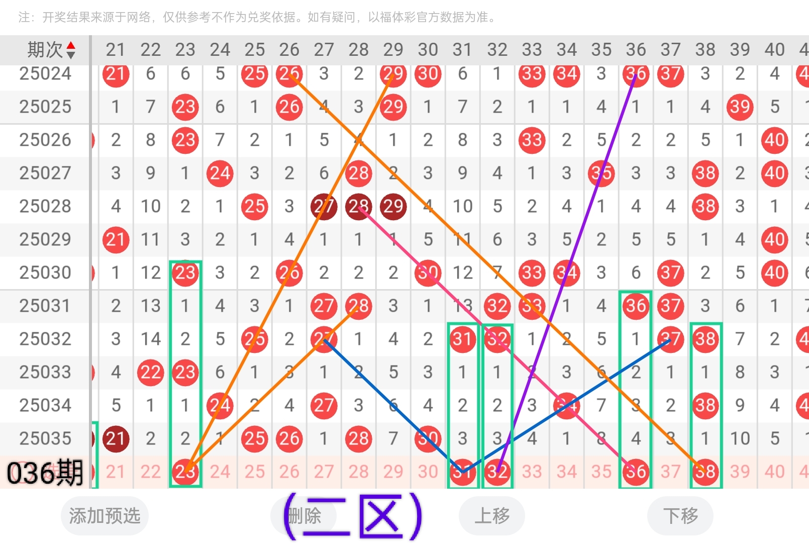 小梁结合最近五期第二区开出的号码比例6:6:2:4:5,取五期平均值,预判本期第二间开出的号码个数约为5个。首先,我们根据上图画线的思路可以看出,号码23与前几期开出的号码呈连续隔两期回补的走位且呈两条斜六连斜三连的走势;号码31与前几期开出的号码呈两条左右斜三连的走势且呈隔三期回补的走位;需关注一下。其次,号码32与前几期开出的号码呈隔三期回补的走位且呈斜四连的走势;号码36与前几期开出的号码呈斜五连的走势且呈隔四期回补的走位。然后,号码38与前几期开出的号码呈连续隔期回补的走位且呈斜三连的走势。最后,小梁根据上图走势,预判本期第二区开出的号码是23、31、32、36、38。