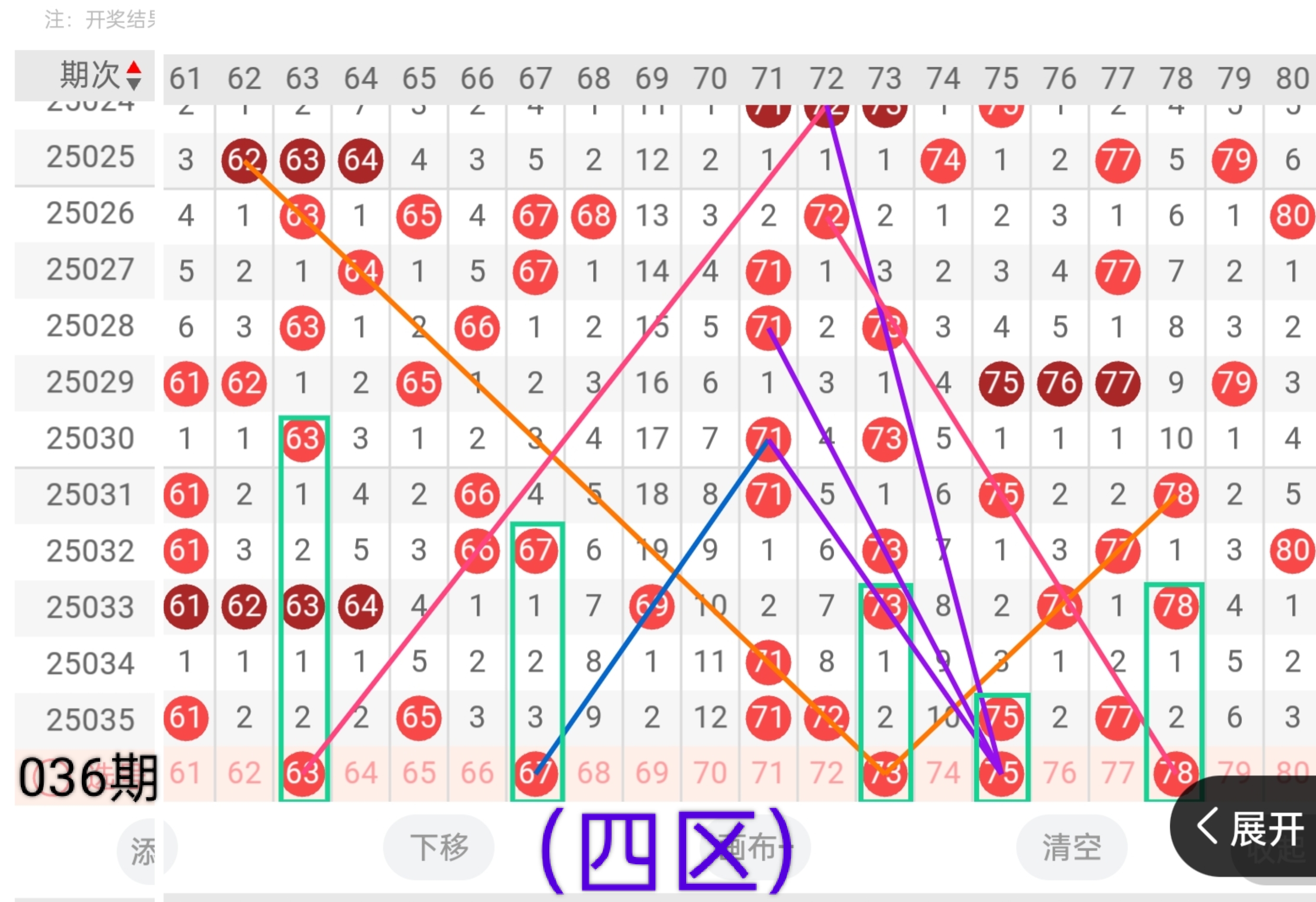 小梁结合最近五期第四区开出号码比例5:6:8:1:6,取五期平均值,预判本期开出的号码个数约为5个。首先,我们根据图中画线的思路可以看出,号码63与前几期开出的号码呈连续隔两期回补的走位且呈斜三连的走势。其次,号码67与前几期开出的号码呈斜三连的走势且呈隔三期回补的走位;号码73与前几期开出的号码呈隔两期回补的走位且呈两条左斜六连右斜四连的走势。然后,我们根据图中思路可以看出,号码75与前几期开出的号码呈三条斜三连的走势且呈直连回补的走位;号码78与前几期开出的号码呈隔两期回补的走位且呈斜三连的走势。最后,小梁根据图中画线的走势,预判本期第四区开出的号码是63、67、73、75、78。