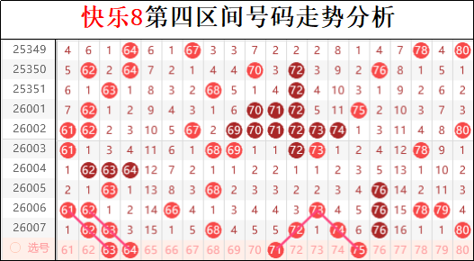 四区目前最明显的走势是连续两期开出多码,本期四区能不能延续走势继续出现七码是值得期待的。但是四区出现了重号的延续和连码的持续走势,所以本期四区不排除第三期继续开出多码走势,但是要注意回补连码的可能性也是最大的。尤其警惕“断头铡”式回调风险,一旦连码断裂将迅速转冷,形成四区空档。但若68-69或75-76等连体结构再现,则多码格局有望延续。建议重点关注中段64-67补缺机会,搭配重号70的二次回补可能,四胆可从中择机突围。尤其是等差数列缺席一码的走势是本期最大的回补热点。