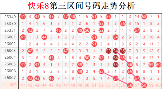 三区上一期再次失去重号的走势,但是前端明显隔期走势回补的还是明显的,所以这也预示着本期前半部分会再次出现中断的走势。目前来看,后端走势或将成为本期布局的重点。另外不排除本期三区将再次转冷的可能性,所以布局上注意三区整体走势。尤其注意本期三区空区出现在那里,或者出现连码的思路将在本期闪现。目前阶梯走势是三区最明显的布局,但是是不是坑不好说。总体来说三区走势存在分化风险,中段49-54区间已连续多期低迷,一旦反弹将直接冲击四胆格局。重点关注41、44、50三档点位的回补动能,尤其50作为分水岭信号强烈。若三区前端无法延续隔期呼应,则资金可能快速回流中段形成反扑,建议搭配冷热比2:2进行卡位布局。